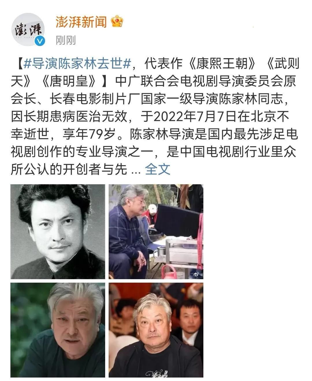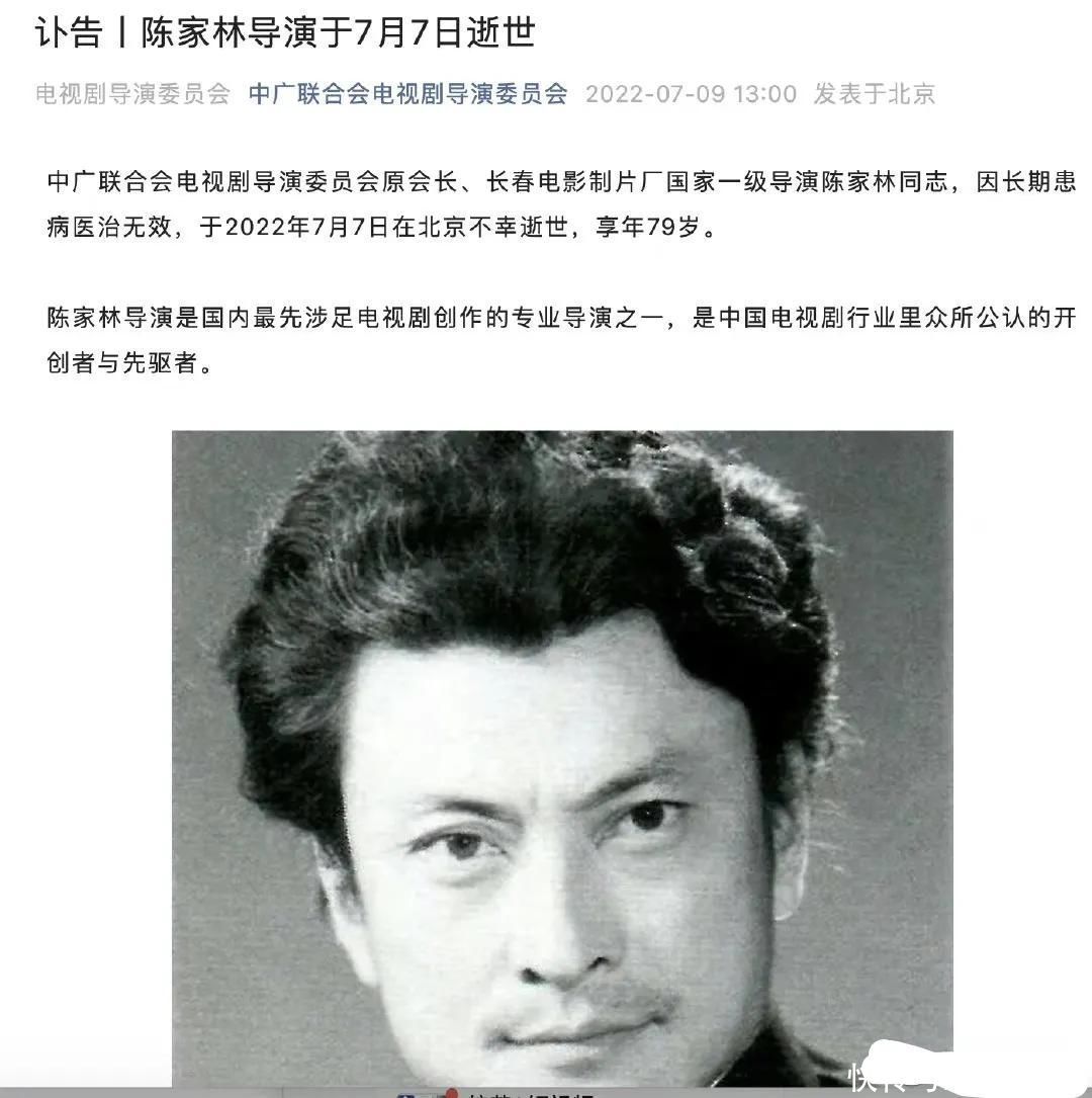 要不是7月9日中广联合会电视剧导演委员会发布的这则讣告,估计很多观众都没有意识到,“陈家林”这个导演界声名显赫的名字,已经在公众视线里消失了太久。
