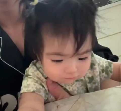 视频中,姜潮抱着女儿艾米丽,九个月的艾米丽扎着两小辫,前面的刘海有些许凌乱,仿佛才睡了午觉,艾米丽五官简直和麦迪娜太像来,浓浓的眉毛,两只大眼睛水灵水灵的,和哥哥丹尼尔一样都是睫毛精。艾米丽正在用手在桌上拍打着,突然抬头就喊起了爸爸,这可把姜潮高兴坏了。