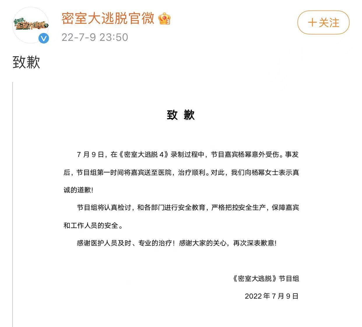 7月9日,有网友爆料,杨幂在录制《密室大逃脱4》时意外受伤,几个小时后节目组发文道歉,引发网友热议。