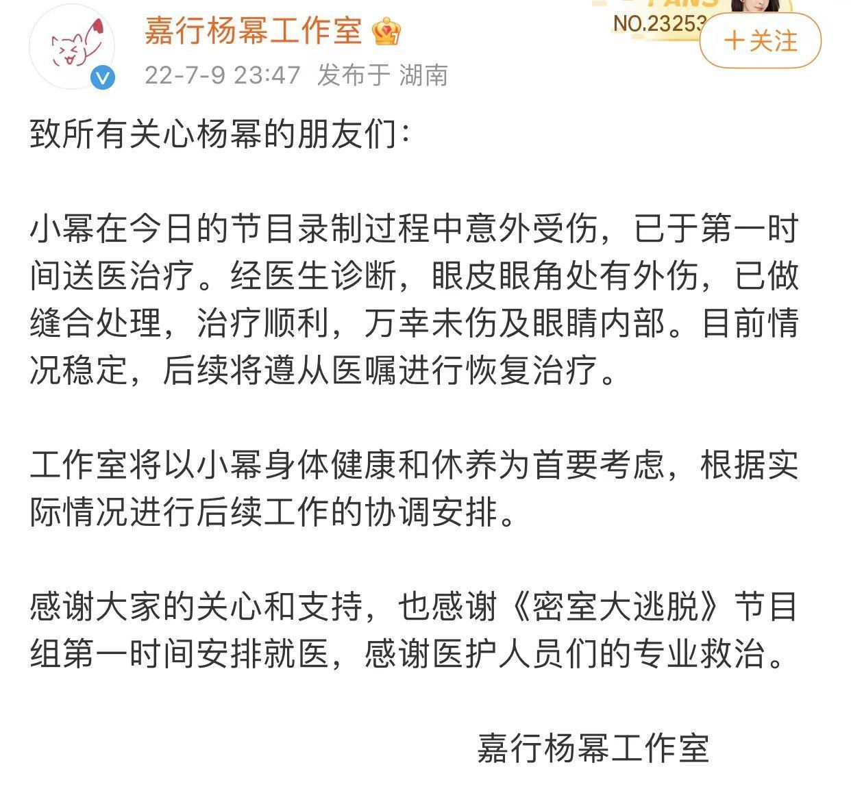 文中,工作室证实了杨幂受伤的消息,并表示《密室大逃脱4》的节目组已经在时间将杨幂送医治疗。