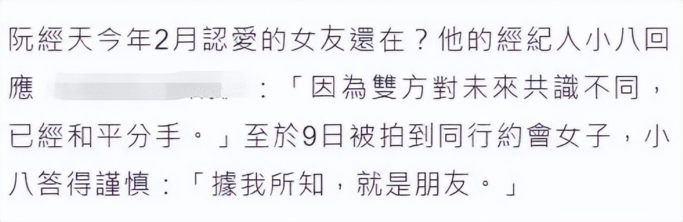 很显然,这一次和阮经天外出的女生并不是官宣女友,网友随即开始猜测两人早已分手还是阮经天再次劈腿?基于阮经天本就岌岌可危的情感信用,各种声音马上席卷网络,很快阮经天经纪人回复称两人因对未来共识不同已经分手,本次同行的女生也仅仅只是阮经天的朋友。