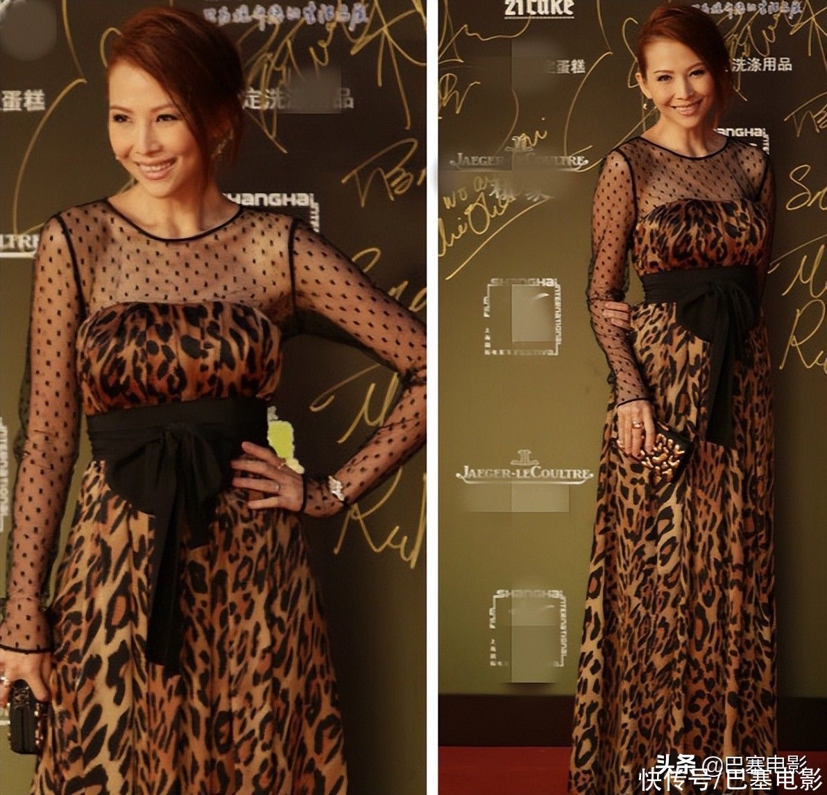 早些年时候蔡少芬的审美也有点难get到,大胆的豹纹图案,中间系着累赘的蝴蝶结,肩颈部分还是透明波点,这么混搭下来,真没看出她的时尚感,有点俗艳。