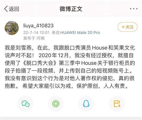 据了解,笑果文化于2020年对三个自媒体账号提出诉讼,三个账号未经授权搬运了脱口秀演员House在《脱口秀大会》第三季中的段子进行视频演绎并传播。目前,其中一位被告已在微博发布了道歉声明。