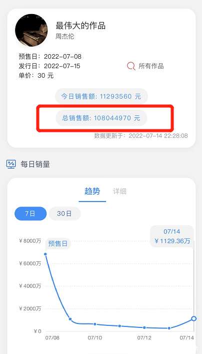 在所有歌曲上线一个小时后,某音乐平台总销售额破亿,单日销售额一千多万,周杰伦号召力实在是强啊!