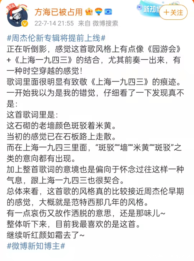 除此之外,还有主打歌曲《倒影》,有博主认为歌曲风格上有点儿像《园游会》+《上海一九四三》的结合,连歌词都差不多,有周杰伦早期内味儿,很惊喜。