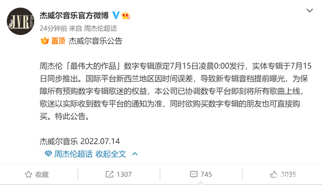 据杰威尔音乐公司称,字数专辑原定于7月15日零点发行,实体专辑也将同日推出,结果因为国际平台新西兰地区的时间误差,导致专辑歌曲提前曝光,最后不得不提前将所有歌曲即刻上线。不得不说,这个失误简直就是大无语!