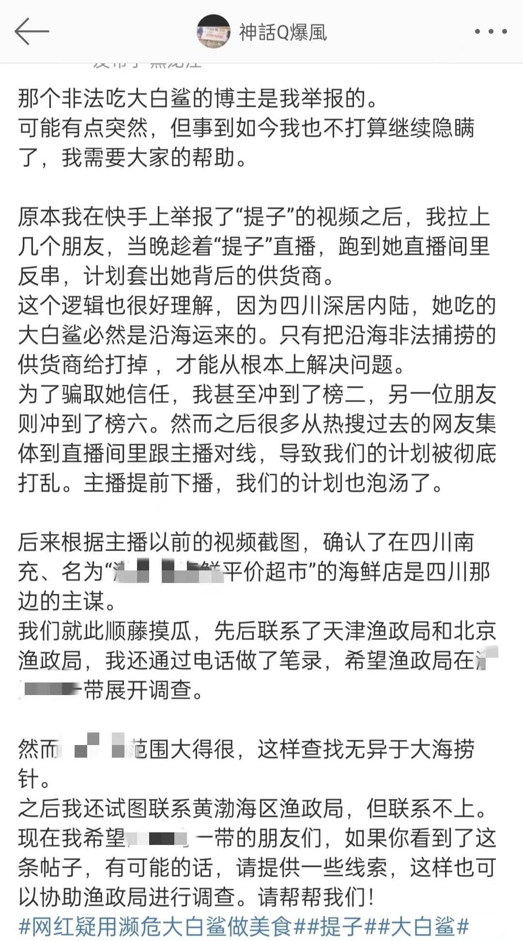 为找出背后供应商,“神話Q爆風”策划了一系列活动。称在事情发酵之前,就已发现“提子”视频中鲨鱼疑似是二级保护动物。Q先生是黑龙江人,毕业于东北大学。“我是一名生态生物保护关注者,朋友刷到‘提子’视频中的鲨鱼,截图给我。”