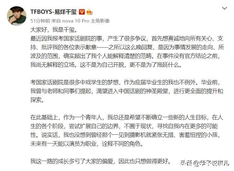 在声明的最后,易烊千玺决定放弃入职话剧院,并且也再次为这件事情中受伤的人们道歉了。