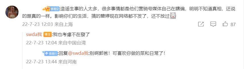 有网友给郭爸留言说,“造谣生事的人太多,很多事情都是他们营销号自己在瞎编,明明不知道真相,还说得跟真的一样。影响你们的生活,搞得郭碧婷现在网络(社交平台)都不发了,还不放过。”对此,郭爸还回复说,自己也考虑不发了。