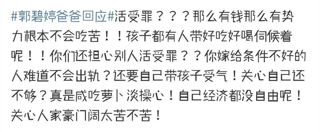 有网友说,“那么有钱那么有势力根本不会吃苦!孩子都有人带,好吃好喝伺候着呢!你们还担心别人活受罪?你嫁给条件不好的人难道不会出轨?还要自己带孩子受气!关心自己还不够?真是咸吃萝卜淡操心!自己经济都没自由呢!关心人家豪门阔太苦不苦!”