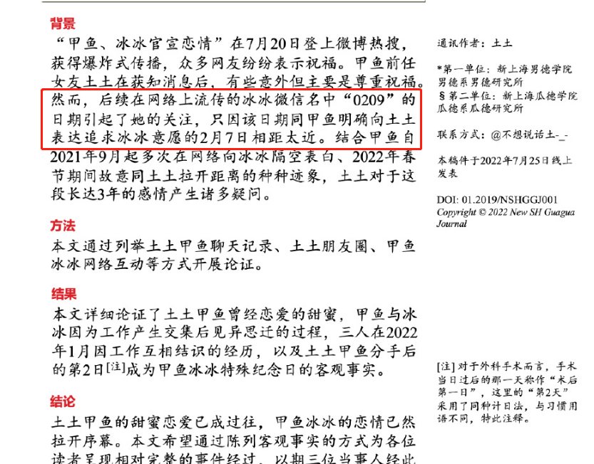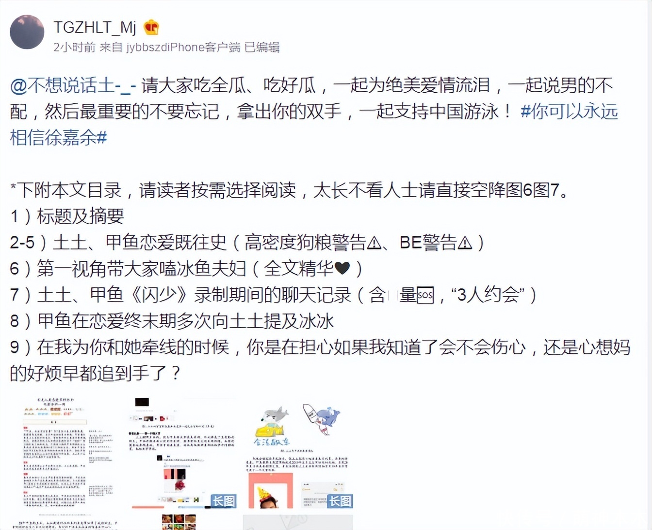徐嘉余前任女朋友土土是一名外科医生,她邀请大家吃瓜的资料十分严谨,以论文的形式发出了有理有据的质疑。全文一共有9张大图,前五张讲了自己与徐嘉余的恋爱史,后五张就是徐嘉余爱上王冰冰的踪迹,以及潜在劈腿的可能性。