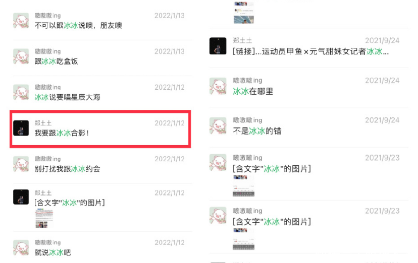 土土晒了徐嘉余在聊天对话中提及冰冰的次数,其中有一个特殊日期1月12日,这是徐嘉余与王冰冰录制《闪亮的日子》时间,也是他们三人共同聚餐的时间点。