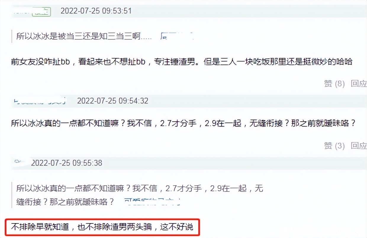 看到前女友质疑的时间点,网友也觉得三人吃饭的关系很微妙,王冰冰与小情侣吃饭的时候,两人穿了情侣装,间接锤了王冰冰对徐嘉余有女朋友知情,所以就有网友认为王冰冰在中间的关系很尴尬,但也有人辩解徐嘉余可能两头骗。