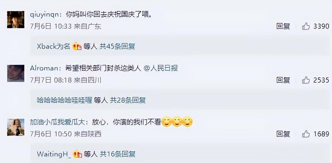而吕丽萍呢也经常通过个人账号替儿子宣传新电影,为他的表演事业铺路!这不前不久张博宇在社交平台上官宣了新剧开机,而吕丽萍作为亲妈自然不会放过这个为儿子打call的机会。所以就屁颠屁颠的跑来庆祝!可是估计就连她都没想到,大家对此不仅没有表示祝贺反而全是呼吁封杀和抵制。不少网友建议张博宇不要拍戏了赶快去***那庆祝国庆比较重要!!甚至还有人私信剧组希望能换掉张博宇~