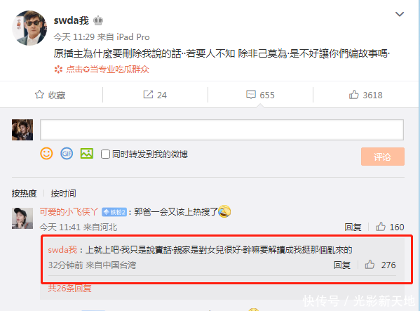 可能是不想把事情闹大,被郭碧婷爸爸转发之后,这个营销号将原文删除了。当郭碧婷爸爸看到原文删除后,又在27日中午11点29分再发一条内容,写的是“原博主为什么要删除我说的话,若要人不知,除非己莫为,是不好让你们编故事吗?”