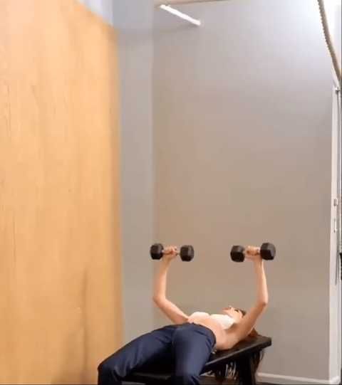 再一转,安妮海瑟薇躺在长椅上,双手正向上抬举着黑色杠铃。在上下来回抬举的动作中,也能感受到手臂虽然纤细但极具力量感。
