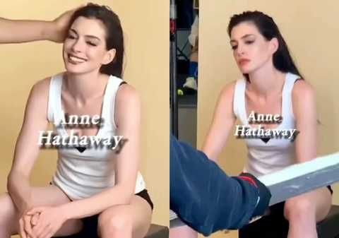 下一张,安妮海瑟薇正在摆着姿势拍照。身穿简单的白色背心,搭配黑色短裤。前额的碎发做了编发处理,将光洁的额头展露了出来。鼻梁高挺,眉骨耸立,五官非常立体。锁骨处的线条,以及肌肤白皙里透着轻微的红,都散发出吸引力。