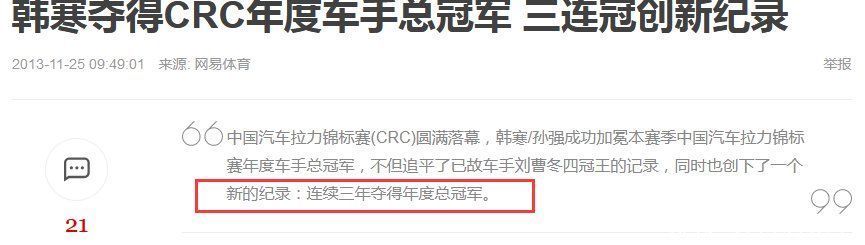 这还不止,随着竞技状态进入,韩寒还在2011到2013间连续3年斩获CRC,这也是国内车坛一个CRC三连冠。