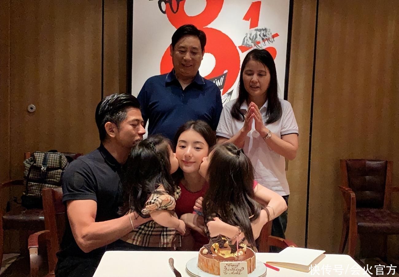 一家人还拍了合照,天王嫂方媛坐在C位上,将两个年幼的女儿抱在怀里。而两个女儿则一人亲吻方媛的一边脸颊。一旁的郭富城则在另一边扶着女儿,担心女儿会站不稳,微微低头注视着妻子,眼神里尽是宠溺。方媛身后站在父母,两人也十分高兴,方媛的母亲还开心地拍起了手,场面十分和谐温馨。