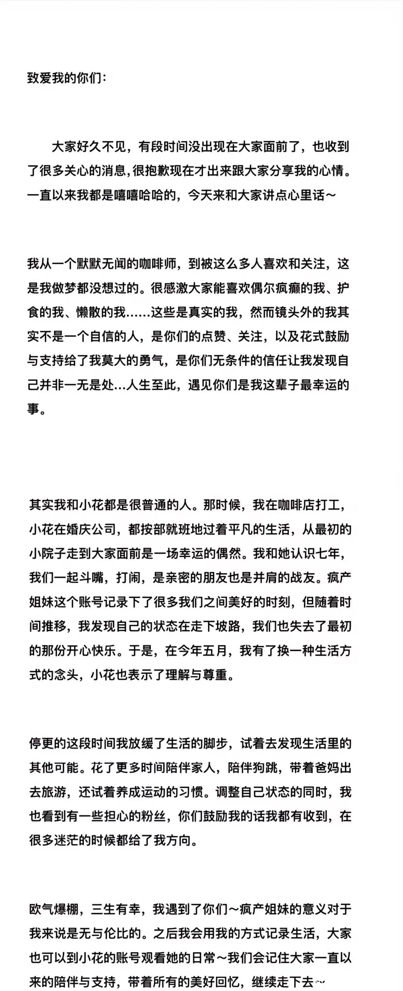 当天晚上,“疯产姐妹”成员张小花突然更新账号,发布长文回忆了自己与邵雨轩相识,到合作拍摄短视频的过程,并解释了她们停更以及解散的原因。