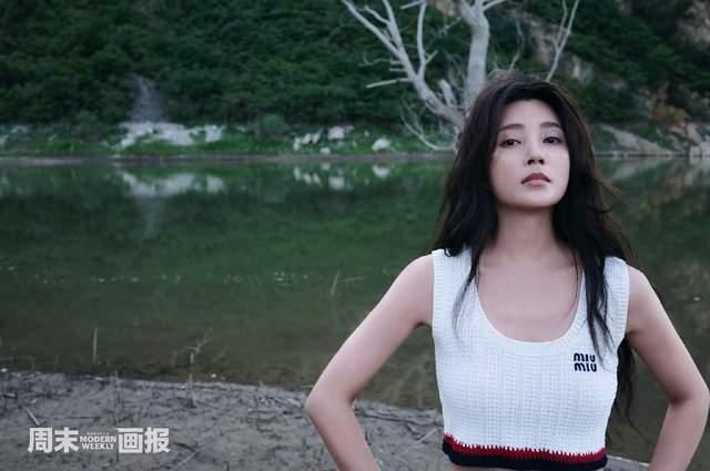 其中还有一张殷桃的正面照,她叉着腰站在湖边,头微微抬起看向镜头,少女和熟女的气质在她身上并存。
