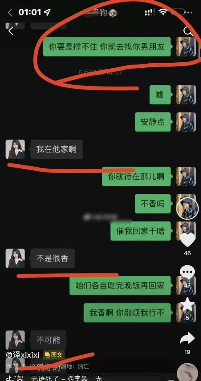 据聊天记录,韩安冉似乎在和马泽鑫闹矛盾时去找了别的男人,马泽鑫给韩安冉发信息叫她别烦他,还叫韩安冉去找她男朋友,韩安冉则表示自己已经在男朋友家了,但是并没有觉得很香。