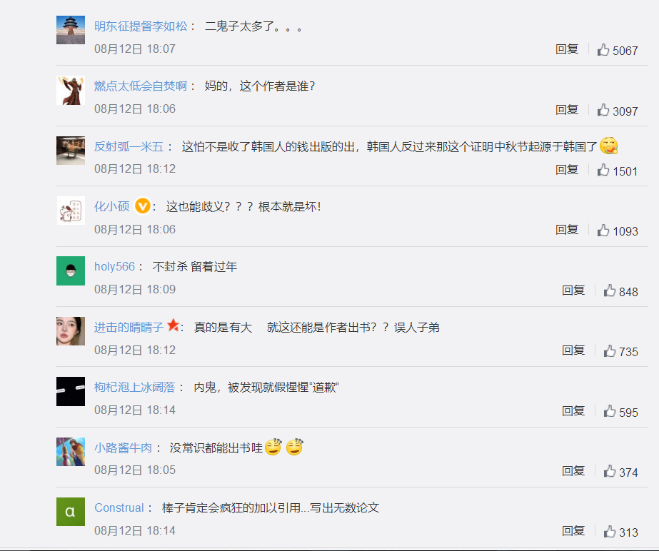 近日,一名作者在《古代人的日常生活》一书中表示,中秋节是“洋节”,起源于韩国,引发了众多网友不满。8月12日,该作者在网络上发文致歉,表示自己表述过于武断、片面,用词也不严谨,特别是“洋节”一词,只追求热点词汇,却造成了歧义。已和出版社沟通,时间在本书的电子版本中将该文删除,纸质书也会在一个月内进行全书审查删改。