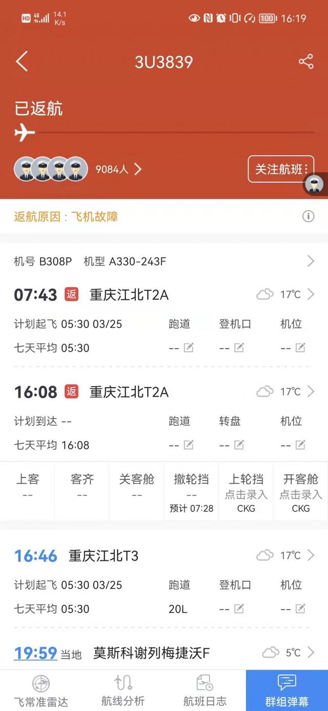 据四川航空宣传部门相关人士核实,该航班因出现微小机械故障,机组出于安全考虑,决定返航。四川航空 3U3839 航班为 25 日 7:43 从重庆江北起飞,原计划将于当地时间 25 日 9:30 抵达莫斯科谢列梅捷沃机场。该航班系货运航班,因起飞后出现机械故障返航。飞机在落地前进行盘旋耗油,于 25 日下午 16 时 08 分安全落地。