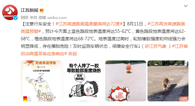 8月11日,江苏再发高速路面高温预警,预计今天图上蓝色路段地表温度将达55-62℃,黄色路段地表温度将达62-68℃,橙色路段地表温度将达68-72℃。地表温度过高时,轮胎橡胶强度和帘线强力会明显降低,存在爆胎危险!及时监测车辆状态,保障安全行车。