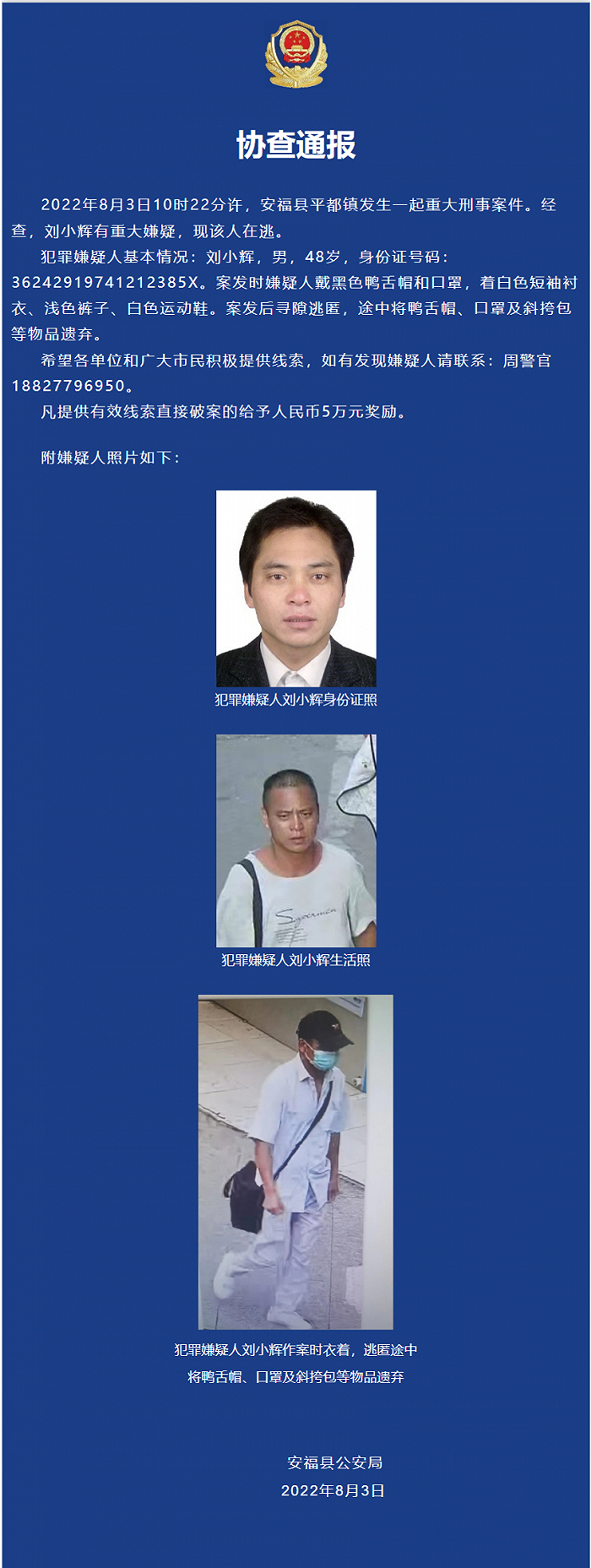“吉安公安”微信公众号消息,8月3日10时22分许,安福县平都镇发生一起重大刑事案件。经查?,刘小辉有重大嫌疑,现该人在逃。