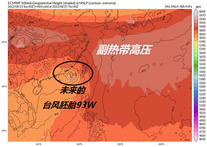 当然,在台风胚胎93W发展靠近之前,南方副热带高压相当强盛,不仅长江流域将继续热浪滚滚,广东广西的炎热也将再次扩大,8月23日的高温预报中指出,8月23日广东广西将再次回到大范围的35度高温区中,37度以上高温区范围也将明显扩大。这么来看,华南还将迎来一段难熬的炎热天气。