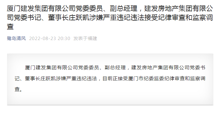厦门建发集团有限公司党委委员、副总经理,建发房地产集团有限公司党委书记、董事长庄跃凯涉嫌严重违纪违法,目前正接受厦门市纪委监委纪律审查和监察调查。