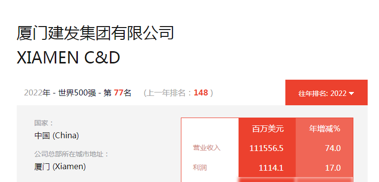 根据建发集团官网,建发脱胎于1980年成立的厦门建设发展公司,目前年营业收入超7000亿元,资产规模超6500亿元。8月3日,2022年《财富》世界500强排行榜发布,三家厦门企业上榜,分别是厦门建发集团、控股集团、集团,其中建发集团排名第77位,成为跻身100强的闽企。
