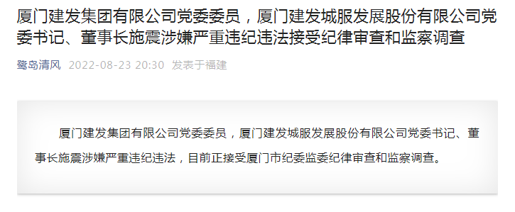 厦门建发集团有限公司党委委员,厦门建发城服发展股份有限公司党委书记、董事长施震涉嫌严重违纪违法,目前正接受厦门市纪委监委纪律审查和监察调查。