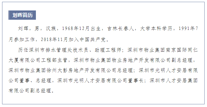 厦门建发集团两高管被调查同日,即8月23日,“廉洁深圳”官微消息披露,深圳市人才安居集团有限公司副总经理刘晖涉嫌严重违纪违法,目前正接受纪律审查和监察调查。