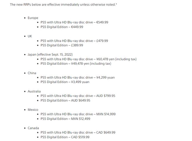 8月25日,索尼宣布,出于国际经济环境、通货膨胀以及汇率因素的影响,将调整部分市场PS5的价格,其中国区价格上涨400元,涨价后,光驱版官方售价4299元、数字版为3499元。
