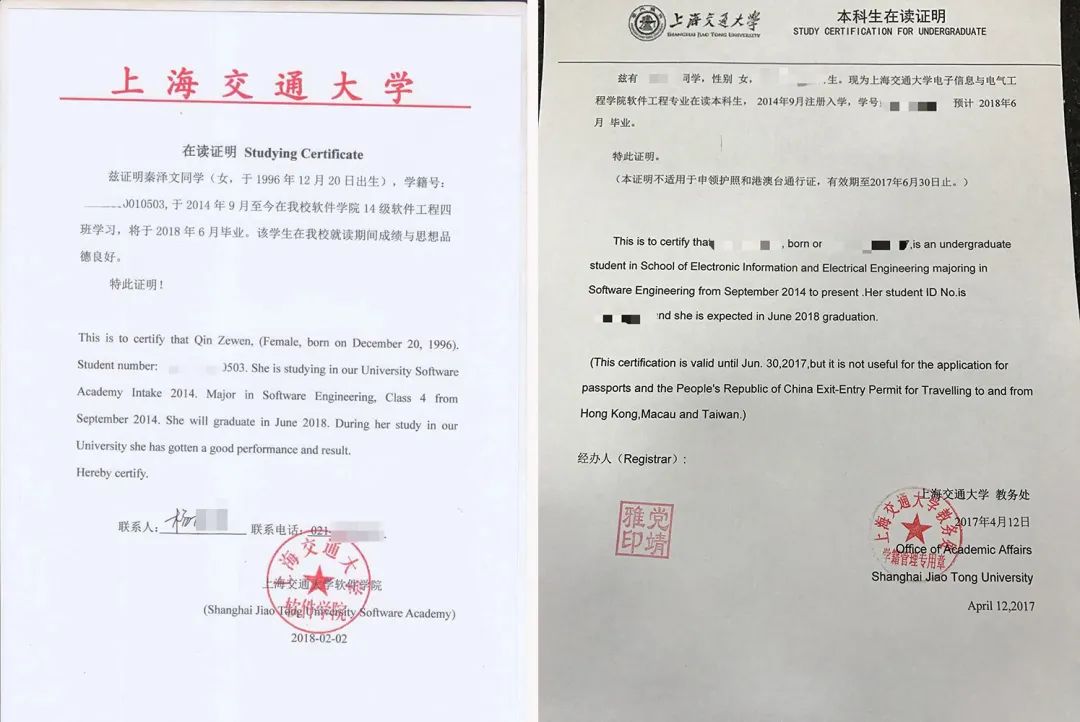上述毕业生表示,近日看到这张网传“在读证明”,发现有几处与自己在读时的信息对不上。如她的“在读证明”此前由学校教务处开具,专业表述为“上海交通大学电子信息与电气工程学院软件工程专业”,网传秦泽文的“在读证明”是软件学院开具,表述为“软件学院软件工程”。