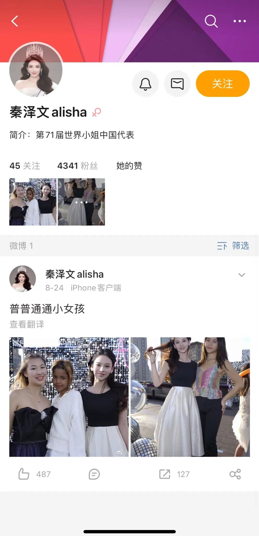 记者注意到,目前秦泽文的个人微博上仅余8月24日晚九时许发布的一则博文,配文“普普通通小女孩”。而此前发布的“会把金融行业女性的声音带去世界舞台”以及“谢谢大家,为了圆儿时的一个梦”等微博已被清理。