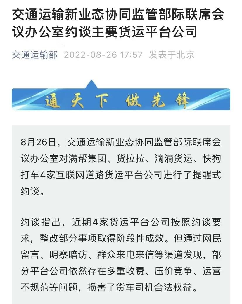 # 存在多重收费、压价竞争等问题,满帮集团、货拉拉、滴滴货运、快狗打车被约谈